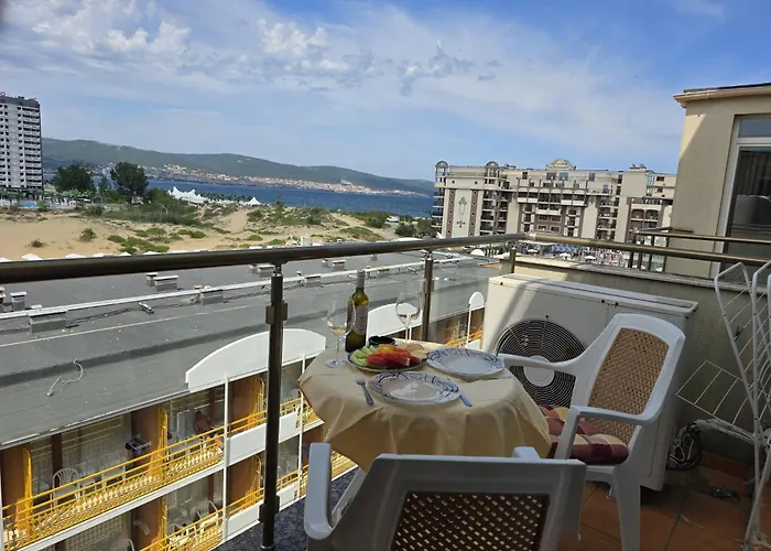 Cu chicinetă pe o terasă, apartmentul spațios Sea View Dune Apartment Sunny Beach cu 1 dormitoare, se află la aproximativ 3 km de Biserica Hristos Pantocrator din Nesebăr. La 25 de minute de mers pe jos de acest apartament de 65 m² se află mai multe obiective turistice, cum ar fi Plaja Chaika.